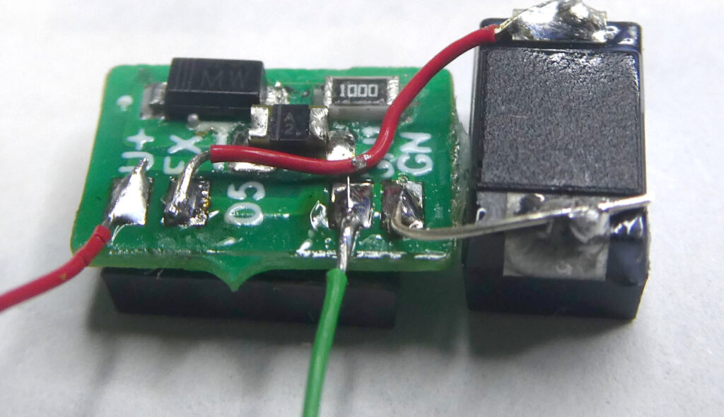 Red wire is U+ or UE+ and green wire is ground. Here the power extender is wired before installation under the rear of the decoder. Remove the plastic shield under the rear of the decoder to make more room for the power extender. Also trim the light guide for the rear light to make room for the added 470uFd capacitor.