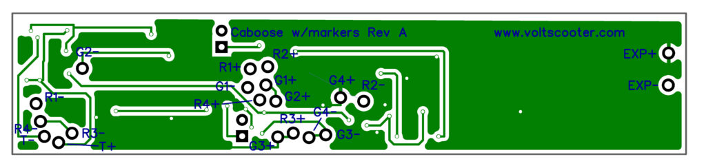 Solder the leads from your red and green marker LED lights to the R & G pads to on the light board. Resistors are already installed on the light board so external resistors are not required. The first red LED should be connect to the R1+ and R1- connections on the circuit board. There are two sets of LED marker lights. Only one set is on at a times. R1, R2, G1 & G2 are in the first set and R3, R4, G3 & G4 are in the second set. Normally the R LEDs are visible from the rear of the train and the G LEDs are visible from the front of the train.