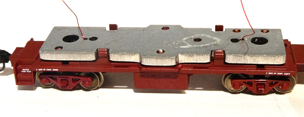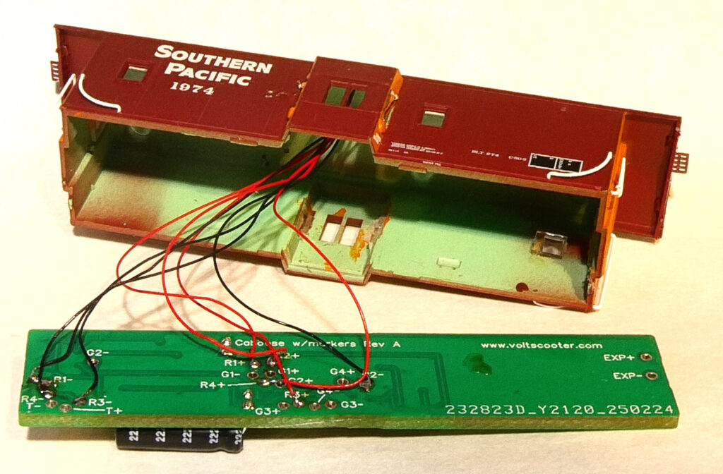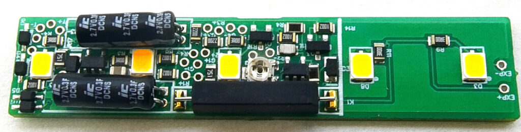 Super-capacitors and regulators provide constant lighting. Each board has 5 LEDs to insure uniform lighting (see photos). The LEDs are designed to simulate incandescent style lighting. Instructions and most parts for installation in cars without pickups are included. Metal wheels are required and must be obtained separately. You can use supplied parts to make your own pickups. Adjustable from dim to bright. When adjusted for normal light levels the car will remain lit at constant brightness for up to a 15 seconds after power is removed. Size: 2.45″(62 mm) x 0.51”(13 mm) x 0.23”(6 mm). Can be shortened as much as 0.83″ (21 mm) to a length of 1.61″ (42 mm).. Click here to download the product pamphlet and description. See below for installation information. Price is $39.95.