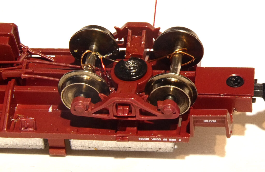 Solder the magnet wire to the copper phosphor bronze contact wire at a convenient place between the wrap and the plastic bolster. Be careful not to melt the bolster. Repeat for the other truck. Position the insulated wheels of the second truck on the opposite side of the car so that you have a pickup on each rail.
